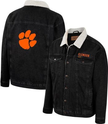 This button-up denim jacket from the Colosseum x Wrangler collection is a great layer to sport on game day. It features an understated Clemson Tigers wordmark above the left chest pocket and a bold logo on the back for a spirited look. A heavyweight design and Sherpa lining help to sustain warmth and comfort, while loads of pockets provide storage.