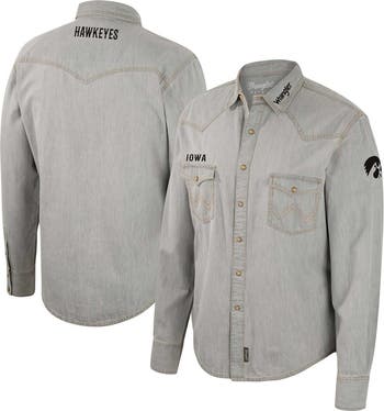 The Men's Colosseum x Wrangler Gray Iowa Hawkeyes Cowboy Cut Western Full-Snap Long Sleeve Shirt is a stylish and comfortable way to show your support for the Iowa Hawkeyes. Made from durable cotton, this shirt features embroidered graphics, two chest pockets with snap closures, and a rounded droptail hem. The cuffs with two-snap closure add a touch of Western flair, while the woven clip tag proudly displays the Iowa Hawkeyes logo. Whether you're cheering on the Hawkeyes at the game or just showing your team spirit around town, this shirt is sure to turn heads.