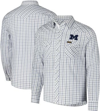 Combine your love for the Michigan Wolverines and timeless style with the Colosseum x Wrangler Plaid Window Pane Long Sleeve Full-Snap Shirt. Made from soft-to-the-touch, 100% cotton fabric, this shirt provides lasting comfort for all-day wear. The embroidered team graphic on the left chest proudly showcases your Michigan Wolverines spirit.