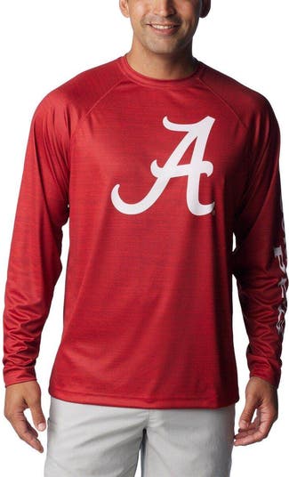 The Men's Columbia Crimson Alabama Crimson Tide PFG Terminal Tackle Omni-Shade Raglan Long Sleeve T-shirt is the ultimate way to support the Crimson Tide. Made with Omni-Wick technology, this shirt keeps you cool and dry on the hottest game days. Raglan sleeves and flatlock stitching provide a comfortable fit, while heat-sealed graphics ensure your team pride never fades. With UPF 50 protection, this shirt shields you from the sun's harmful rays.