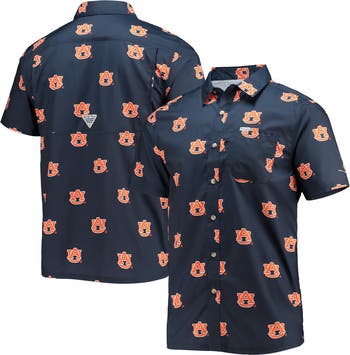 The Men's Columbia Navy Auburn Tigers Super Slack Tide Omni-Shade Button-Up Shirt is the perfect way to show your support for the Auburn Tigers. Made from durable polyester, this shirt features a full-button front, droptail hem with side splits, and heat-sealed graphics that proudly display the Auburn Tigers logo. The back mesh ventilation insert keeps you cool and comfortable, while the interior patch for cleaning sunglasses at the bottom of the buttons adds a touch of convenience. Whether you're cheering on the Tigers at the stadium or just showing your support around town, this shirt is sure to turn heads.