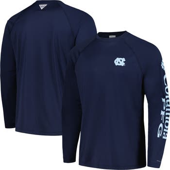 The Men's Columbia Navy North Carolina Tar Heels Terminal Tackle Omni-Shade Raglan Long Sleeve T-shirt is the perfect way to show your support for the Tar Heels. Made from durable polyester, this shirt features flatlock stitching for added comfort and raglan sleeves for a stylish look. The Omni-Shade technology provides UPF 50+ sun protection, so you can stay protected from the sun's harmful rays while cheering on your team. Whether you're at the game or just hanging out, this shirt is a great way to show your North Carolina Tar Heels pride.