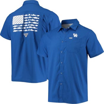 The Columbia PFG Royal Kentucky Wildcats Slack Tide Camp Button-Up Shirt is the perfect way to show your support for the Kentucky Wildcats. Made from durable polyester, this shirt features a droptail hem with side splits for added comfort and style. The glasses cleaning patch at the bottom of the buttons is a convenient touch, and the left chest pocket with utility loop provides ample storage space. The screen print graphics proudly display the Kentucky Wildcats logo, and the UPF 50+ protection keeps you safe from the sun's harmful rays. The ventilated back panel ensures you stay cool and comfortable, even on the hottest days. With its Omni-Shade technology, this shirt blocks UVA and UVB rays, so you can enjoy the game without worry.