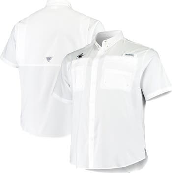 The Men's Columbia White Dallas Cowboys Big & Tall Tamiami Woven Button-Down Shirt is the perfect way to show your support for the Dallas Cowboys. This stylish shirt features embroidered graphics, left and right chest pockets with hook and loop closures and snaps, and mesh-lined panels for ventilation. The rod holder with hook and loop closure and rounded hem with hem splits add a touch of functionality. Made from durable polyester, this shirt is built to last. Whether you're cheering on the Cowboys from the stands or just showing your team spirit, this shirt is a must-have for any Dallas Cowboys fan.