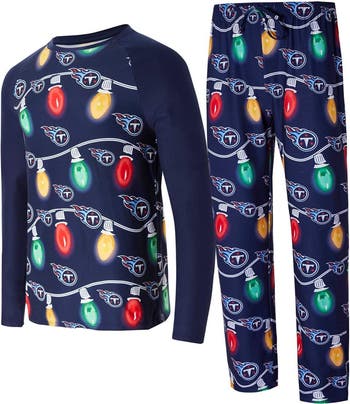 Cozy up for game day and every day with this Tennessee Titans Garland Knit Raglan Long Sleeve T-Shirt and Pants Set from Concepts Sport. Made from a comfortable blend of cotton and polyester, this set features raglan sleeves for a roomier, more relaxed fit, perfect for unwinding after a Titans game. With all-over repeating graphics of the team logo and string lights, this festive set ensures you can celebrate your Tennessee Titans fandom in style and comfort.