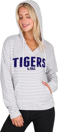 Show your LSU Tigers pride in cozy comfort with this French Terry Striped V-Neck Pullover Hoodie from Concepts Sport. The dropped shoulders create an oversized, relaxed fit, perfect for lounging or layering on game day. The distressed graphics printed across the chest add a vintage touch, showcasing your LSU Tigers pride in style.