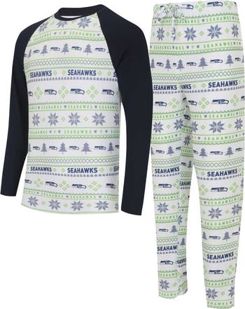 Combining comfort with your Seattle Seahawks fandom is easy thanks to this Concepts Sport Tinsel Sleep set. It includes a soft tee with roomy raglan sleeves and pants with an adjustable waist and open-leg silhouette. Each piece features spirited Seattle Seahawks graphics that also spotlight your love for the winter season.