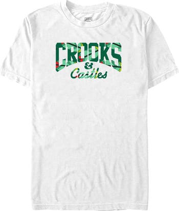 Behind every castle, there's always a crook! That's the motto of Crooks & Castles, where luxury and streetwear combine to celebrate the hustle to get to the crown. This Men's Crooks & Castles Black Tropical Print Graphic T-Shirt features the classic brand logo decorated with a vibrant green tropical print across the front. Shop officially licensed Crooks & Castles gear today and get ready to build your empire in style!