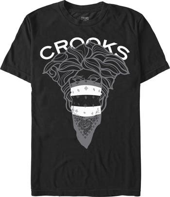 - Strut your stuff with this stylish new men's t-shirt that is perfect for every occasion! Featuring the iconic Medusa with her eyes peering from beneath a cool bandana and the word "Crooks," all in a striking black and white style across the front.
