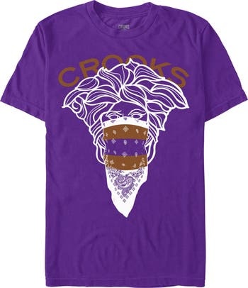 - Strut your stuff with this stylish new men's t-shirt that is perfect for every occasion! Featuring the iconic Medusa with her eyes peering from beneath a cool bandana and the word "Crooks," all in a striking white and brown style across the front.