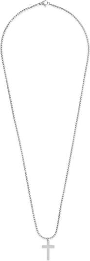 Show your faith with this stainless steel box chain necklace suspending a polished cross pendant.