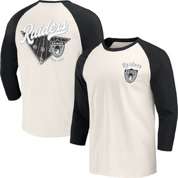 The Men's Darius Rucker Collection by Fanatics Black/White Las Vegas Raiders Raglan 3/4 Sleeve T-Shirt is the perfect way to show your support for the Las Vegas Raiders. With its crew neck, raglan sleeves, and distressed screen print graphics, this shirt is both stylish and comfortable. Made from cotton, this shirt is perfect for any Las Vegas Raiders fan. Whether you're cheering on the team at the stadium or just relaxing at home, this shirt is sure to show your Raiders pride.