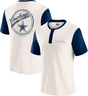 Elevate your everyday style with this Dallas Cowboys Henley Colorblock Slub Pocket T-Shirt from the Darius Rucker Collection by Fanatics. The slub fabric gives it a unique, textured look, while the three-button henley placket elevates this tee beyond your average Dallas Cowboys apparel, making it a stylish way to show your team spirit.. The distressed, printed wordmark on the front pocket and team graphics on the back with the established year offer a vintage look that highlights your Dallas Cowboys pride.