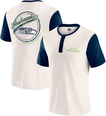 Elevate your everyday style with this Seattle Seahawks Henley Colorblock Slub Pocket T-Shirt from the Darius Rucker Collection by Fanatics. The slub fabric gives it a unique, textured look, while the three-button henley placket elevates this tee beyond your average Seattle Seahawks apparel, making it a stylish way to show your team spirit.. The distressed, printed wordmark on the front pocket and team graphics on the back with the established year offer a vintage look that highlights your Seattle Seahawks pride.