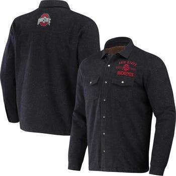 Prep your wardrobe for changing weather conditions with this Ohio State Buckeyes full-snap shacket from Darius Rucker Collection by Fanatics. Its extra-soft Sherpa lining provides the cozy warmth of a hoodie, while the exterior has the dressier look of a jacket. A speckled pattern all over adds visual interest to the versatile style of this Ohio State Buckeyes layer.