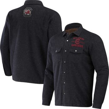 Prep your wardrobe for changing weather conditions with this South Carolina Gamecocks full-snap shacket from Darius Rucker Collection by Fanatics. Its extra-soft Sherpa lining provides the cozy warmth of a hoodie, while the exterior has the dressier look of a jacket. A speckled pattern all over adds visual interest to the versatile style of this South Carolina Gamecocks layer.