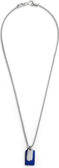 A classic dog-tag necklace featuring an intricate rope chain gets a bold burst of color via a vibrantly hued second tag.