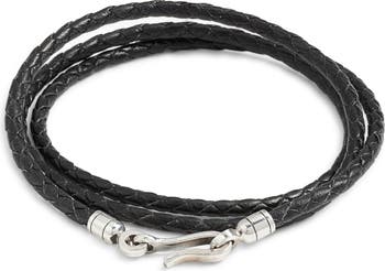 A gleaming sterling silver clasp secures an artfully braided bracelet constructed from durable cowhide leather and designed to wrap around the wrist thrice.