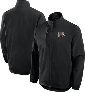 Represent your Philadelphia Flyers pride on the ice or off with this Authentic Pro Rink Coaches Full-Zip Jacket from Fanatics. This lightweight jacket features heat-sealed Philadelphia Flyers graphics and a mock neck collar to keep you warm during the game. The full-zip with zipper pull and zipper garage make it easy to get on and off, while the elastic cuffs and two front zippered pockets provide a comfortable and secure fit. Whether you're cheering on the Philadelphia Flyers at the rink or watching from home, this jacket will keep you comfortable and stylish.