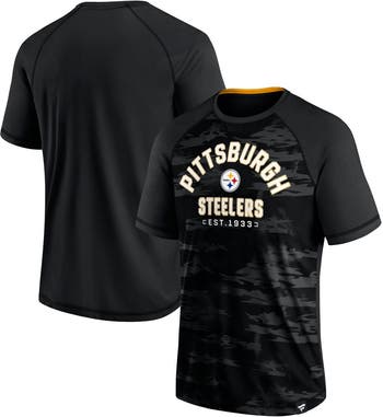 The Men's Fanatics Branded Black Pittsburgh Steelers Hail Mary Raglan T-Shirt is a must-have for any devoted Pittsburgh Steelers fan. With its striking sublimated camo pattern and screen print graphics, this T-shirt proudly displays your unwavering support for the Steelers. The raglan sleeves and flatlock stitching provide both comfort and durability, making it perfect for game day or any day you want to show off your Steelers pride.