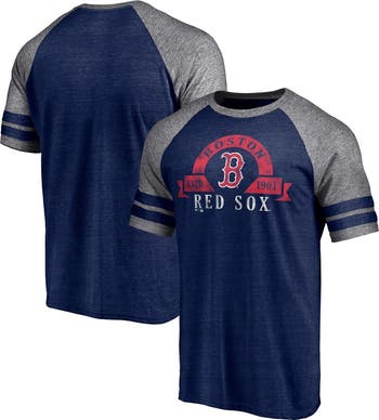 The Men's Fanatics Branded Heather Navy Boston Red Sox Utility Two-Stripe Raglan Tri-Blend T-shirt is a must-have for any loyal Boston Red Sox fan. With its distressed screen print graphics, raglan sleeves, and sewn-on stripes, this shirt exudes a vintage look that pays homage to the team's rich history. Made from a comfortable blend of polyester, cotton, and rayon, this tri-blend t-shirt is perfect for game day or any day you want to show your support for the Boston Red Sox.