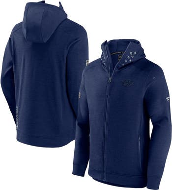 The Men's Fanatics Branded Heather Navy Nashville Predators Authentic Pro Road Tech Full-Zip Hoodie Jacket is the perfect way to show your support for the Nashville Predators. This midweight jacket is made of a durable polyester and elastane blend, perfect for moderate temperatures. The full-zip design makes it easy to get on and off, and the two side zippered pockets are perfect for storing your essentials. The vented scuba hood without a drawstring provides extra warmth and protection from the elements. Whether you're cheering on the Predators at the game or just showing your team spirit around town, this jacket is sure to keep you comfortable and stylish.