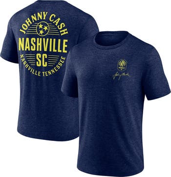 The Men's Fanatics Branded Heather Navy Nashville SC x Johnny Cash Oval T-Shirt is a must-have for any devoted Nashville SC fan. This tri-blend tee features a screen print graphic of the iconic Johnny Cash, paying homage to the legendary musician and the team's Music City roots. Whether you're cheering from the stands or simply showing your support, this T-shirt is the perfect way to represent the Nashville SC and celebrate the legacy of Johnny Cash.