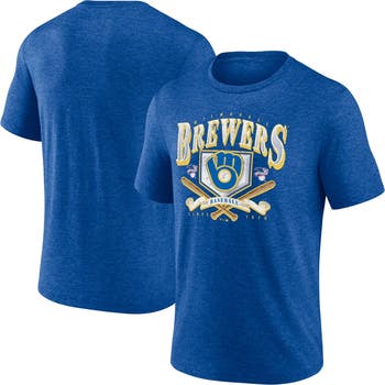 The Men's Fanatics Branded Heather Royal Milwaukee Brewers Home Team Tri-Blend T-Shirt is the perfect way to show your support for the Milwaukee Brewers. Made from a comfortable blend of polyester, cotton, and rayon, this shirt features distressed screen print graphics that give it a vintage look. The crew neck and relaxed fit make it easy to wear, and the Milwaukee Brewers logo on the front shows your team spirit. Whether you're cheering on the Brewers at the stadium or just relaxing at home, this shirt is a must-have for any fan.