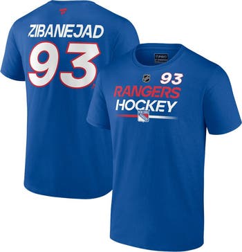 Put your favorite New York Rangers player at center ice with this Mika Zibanejad Authentic Pro Prime Name and Number T-shirt from Fanatics Branded. It features New York Rangers graphics printed across the chest and Mika Zibanejad details displayed on the back. The cotton fabric feels comfortable to wear all day.