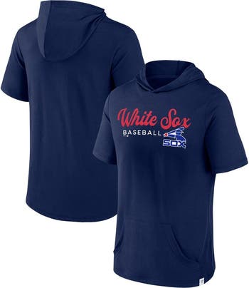 The Men's Fanatics Branded Navy Chicago White Sox Offensive Strategy Short Sleeve Pullover Hoodie is the perfect way to show your support for the Chicago White Sox. Made from a comfortable cotton and polyester blend, this lightweight hoodie is perfect for mild temperatures. The front pouch pocket is perfect for storing your essentials, and the hood with drawstring will keep you warm on chilly nights. The pullover design makes it easy to get on and off, and the rounded hem gives it a stylish look. The screen print graphics proudly display your Chicago White Sox pride.
