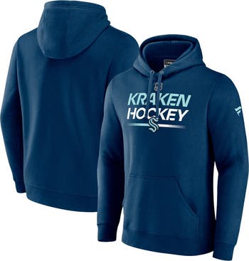 The Men's Fanatics Branded Navy Seattle Kraken Authentic Pro Pullover Hoodie is the ultimate way to show unwavering support for the Seattle Kraken. This midweight hoodie features screen-printed graphics that proudly display the Kraken logo, making it perfect for moderate temperatures. The front pouch pocket provides convenient storage for essentials, while the custom fit ensures a comfortable and stylish look. Whether cheering from the stands or showcasing Kraken pride, this hoodie is a must-have for any true fan.