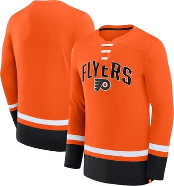 The Men's Fanatics Branded Orange Philadelphia Flyers Back Pass Lace-Up Long Sleeve T-Shirt is a must-have for any devoted Philadelphia Flyers fan. With its faux lace-up neckline and screen print graphics, this shirt is a stylish way to show your support for the Flyers. Made from durable polyester, this shirt is built to last and will keep you comfortable all game long. Whether you're cheering from the stands or watching from home, this shirt is the perfect way to show your Philadelphia Flyers pride.