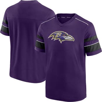 The Men's Fanatics Branded Purple Baltimore Ravens Textured Hashmark V-Neck T-Shirt is a stylish and comfortable way to show your support for the Baltimore Ravens. The textured hashmark design adds a unique touch, while the contrast-color piping on the shoulders and mesh sleeve stripe inserts provide a sporty look. The screen print graphics with faux mesh detail give the shirt a premium feel, and the V-neck design makes it easy to wear. Whether you're cheering on the Ravens at the stadium or just relaxing at home, this shirt is sure to become a favorite.