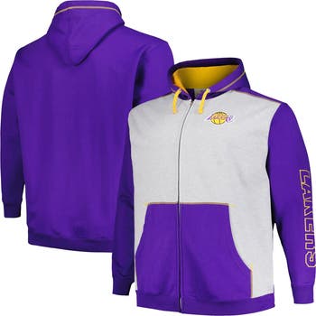 The Men's Fanatics Branded Purple/Heather Gray Los Angeles Lakers Big & Tall Contrast Pieced Stitched Full-Zip Hoodie is the ultimate way to show your unwavering support for the Los Angeles Lakers. This midweight hoodie features a cozy fleece lining, perfect for keeping you warm during chilly games. The contrast-color lining in the hood adds a touch of style, while the embroidered fabric applique and screen print graphics proudly display your Lakers pride. With two front pockets for convenience, this hoodie is a must-have for any true Lakers fan.