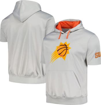 The Men's Fanatics Branded Silver/Orange Phoenix Suns Short Sleeve Pullover Hoodie is the perfect way to show your support for the Phoenix Suns. Made from durable polyester, this midweight hoodie features heat-sealed graphics and an embroidered fabric applique that proudly display the Phoenix Suns logo. The front pocket pouch provides convenient storage for your essentials, while the comfortable fit ensures you'll stay warm and stylish all season long. Whether you're cheering on the Phoenix Suns at the game or just relaxing at home, this hoodie is a must-have for any fan.