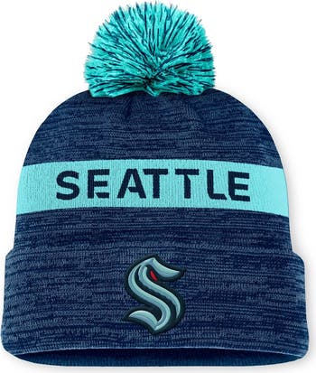 Match your favorite Seattle Kraken players when they hit the road with this Authentic Pro Rink Cuffed Knit Hat with Pom. This Fanatics gear features embroidered team graphics and a classic cuffed design. Stay warm in team style with this sleek Seattle Kraken cap.