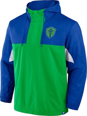 Take on inclement weather in this Seattle Sounders FC Free Kick Woven Quarter-Zip Hoodie Jacket by Fanatics. Its mesh-lined adjustable hood provides customizable coverage from the elements and adds breathability. The crinkle fabric in club colors gives this Seattle Sounders FC jacket a classic look.
