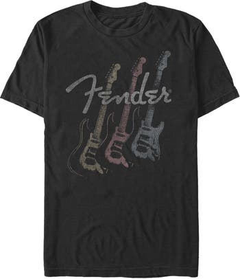 Get ready to hum, strum, and succumb to officially licensed Fender styles! If you've always wanted your very own Stratocaster guitar, now is your chance to get one! Or... at least get one on a rockin' tee! This Men's Tee features a distressed graphic of the Fender logo along with three Stratocasters in yellow, pink, and blue.