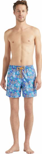 A stylish pair of swim shorts in a fishy print featuring an elasticated waistband and drawstring embellished with Vilebrequin-engraved tips for an elegant finish.