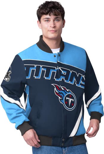 Gear up for game day with this Tennessee Titans Maximum Racing Full-Snap Jacket from G-III Extreme. This heavyweight jacket is perfect for braving the elements on game day, featuring a quilted lining and a stand-up collar for extra warmth. Tackle twill appliques and embroidered details showcase your Tennessee Titans pride, making it clear who you're rooting for.