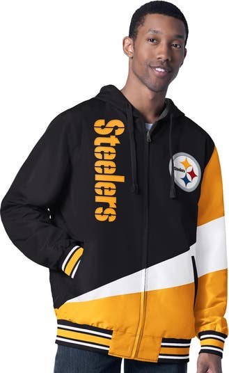 Have the ability to switch up your Pittsburgh Steelers style on the go with this Dual Threat Reversible Jacket from G-III Sports by Carl Banks. This midweight, full-zip jacket is suitable for moderate temperatures and boasts a reversible design, offering two distinct styles to showcase your team pride. Side A features woven polyester material with embroidered twill applique team graphics and bold color blocking, while Side B presents a comfortable cotton/polyester blend with a custom, screen-printed team wordmark and eye-catching splatter paint design. The hood with drawstrings provides customized coverage, and the rib-knit cuffs and hem feature team-colored stripes for a classic athletic look. With its versatile design and construction, this jacket is the perfect way to represent the Pittsburgh Steelers in style.