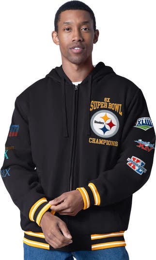 Show your Pittsburgh Steelers pride with this Power Forward Commemorative Full-Zip Hooded Jacket from G-III Sports by Carl Banks. The relaxed fit provides a loose and roomy feel across the chest, shoulders, and body, ensuring maximum comfort whether you're at the game or running errands. The embroidered fabric applique graphics and commemorative logos from Super Bowl victories proudly display your Pittsburgh Steelers pride, making this jacket a must-have for any true fan.
