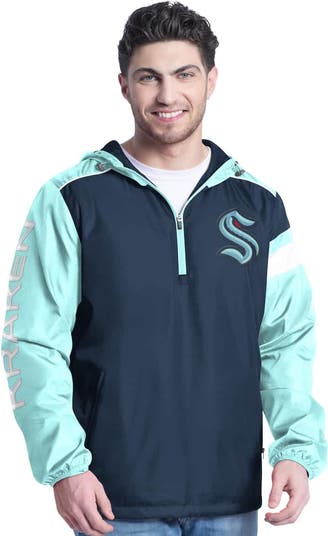Brave windy, rainy or chilly weather without losing an ounce of your Seattle Kraken pride in this Lateral Half-Zip Hoodie Jacket from G-III Sports by Carl Banks. Its design keys in on comfort and storage with mesh lining, a lightweight build, two front pockets and a zipper garage. An adjustable hood protects you from all conditions, while Seattle Kraken colors and embroidered graphics keep you looking sharp at the same time.