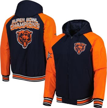 Celebrate Chicago Bears team history with this Defender Varsity jacket from G-III Sports by Carl Banks. It features bold graphics showing the franchise's Super Bowl wins. The warm design, adjustable hood and comfortable raglan sleeves make this full-zip a must-have for cold Chicago Bears games.