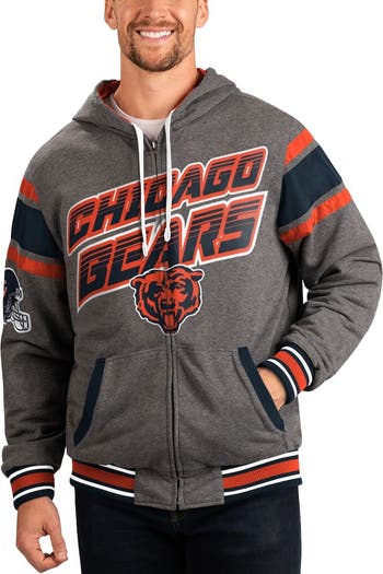 Take your Chicago Bears style to the extreme with this Full Back hoodie from G-III Sports by Carl Banks. Its reversible design gives you two distinct looks with embroidered details on the team color side and printed graphics on the gray side. Coordinating stripes add the final touch to this Chicago Bears full-zip jacket that stands out anywhere you go.