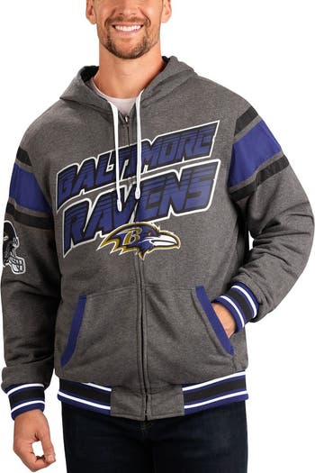 Take your Baltimore Ravens style to the extreme with this Full Back hoodie from G-III Sports by Carl Banks. Its reversible design gives you two distinct looks with embroidered details on the team color side and printed graphics on the gray side. Coordinating stripes add the final touch to this Baltimore Ravens full-zip jacket that stands out anywhere you go.