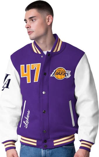 Channel your inner Los Angeles Lakers fan with this G-III Sports by Carl Banks Moneyball Wool & Leather Full-Snap Varsity Jacket. This varsity jacket boasts a classic design with striped rib-knit cuffs, collar, and hem for a secure and comfortable fit. Show off your Los Angeles Lakers pride with the embroidered chenille applique of the team logo on the left chest, the team's established year on the right chest, and the bold team wordmark emblazoned across the back.