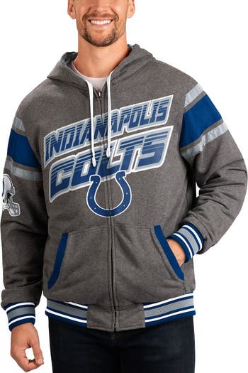 Take your Indianapolis Colts style to the extreme with this Full Back hoodie from G-III Sports by Carl Banks. Its reversible design gives you two distinct looks with embroidered details on the team color side and printed graphics on the gray side. Coordinating stripes add the final touch to this Indianapolis Colts full-zip jacket that stands out anywhere you go.