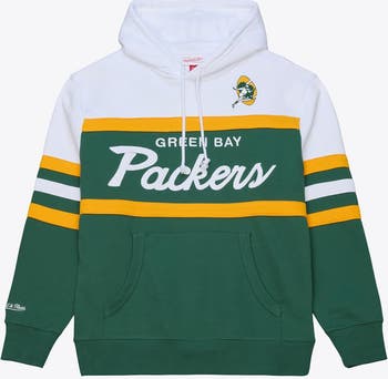 Stay warm while representing the Green Bay Packers in this Mitchell & Ness Head Coach Hoodie. Featuring sewn-on stripes across the chest and elbows, this midweight hoodie is perfect for moderate temperatures. With embroidered graphics and tackle twill details, this hoodie is a premium way to showcase your team pride, while the adjustable drawstring hood and front pouch pocket add extra coverage and convenient storage.