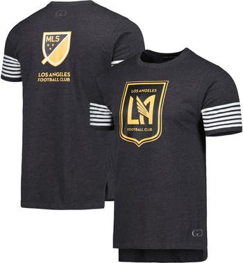 The Men's Grungy Gentleman Charcoal LAFC T-Shirt is a must-have for any devoted LAFC fan. Its classic crew neck, sewn-on stripes, and droptail hem with side splits provide a comfortable and stylish fit. Made from a blend of cotton and polyester, this T-shirt is perfect for showing your support for the LAFC both on and off the field.